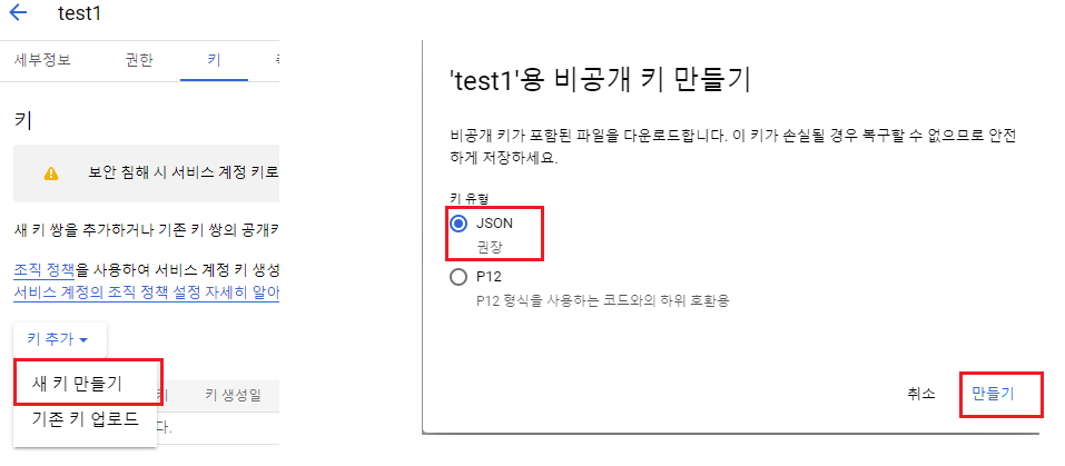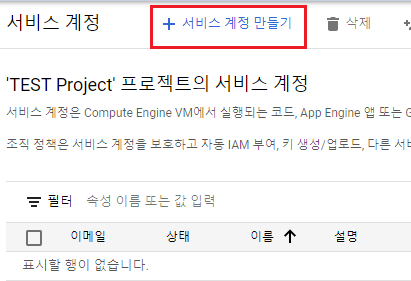 API 및 서비스 - 사용자 인증 정보 - (프로젝트 없을 시 생성 후) 서비스 계정 관리 접속